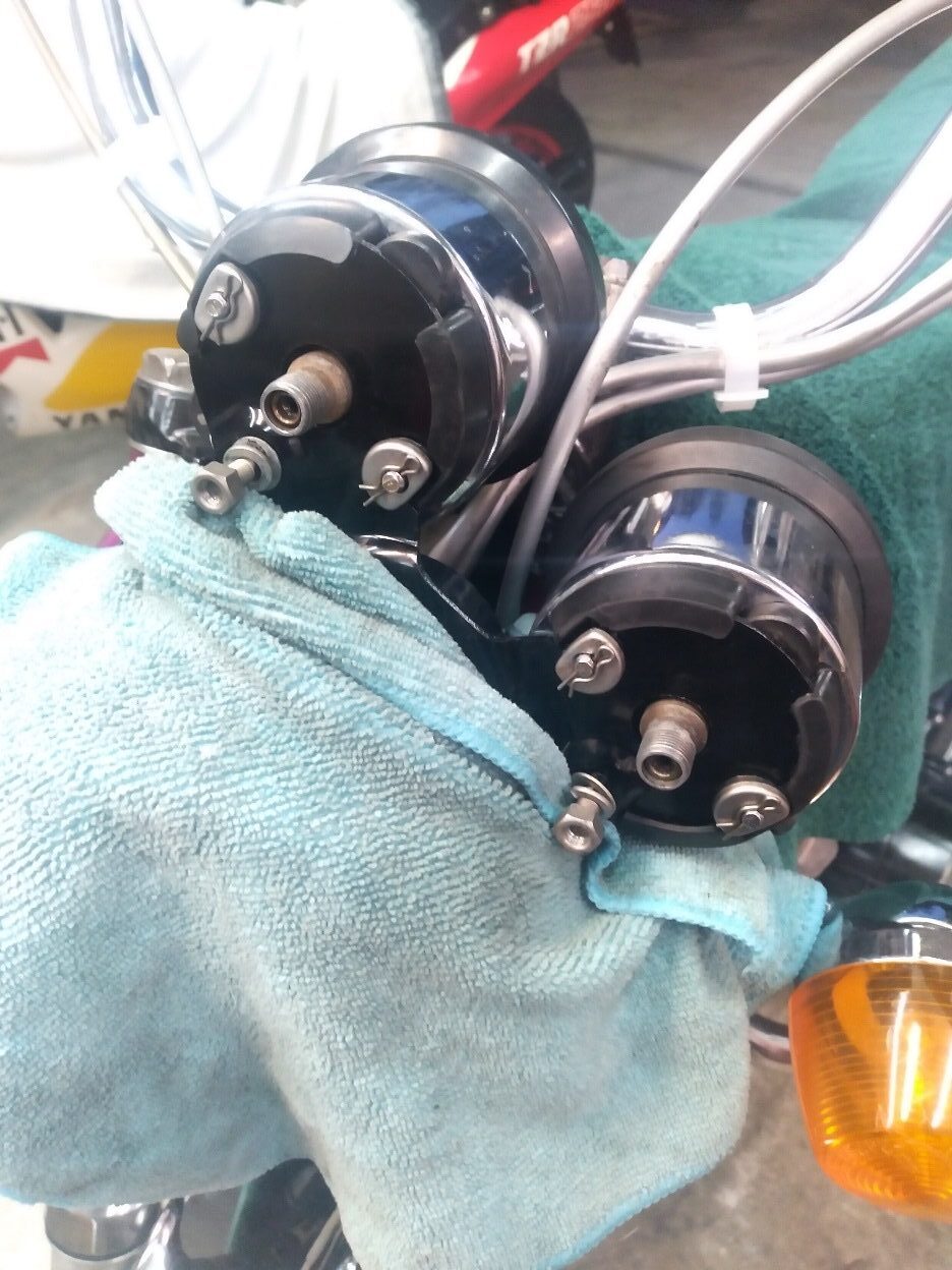 So, since its basically all stock and sort of a rolling restoration of sorts, I eyeballed a stock NOS gauge bracket john @ economy had on his 'used/closeout' page, and had matt dump it in with one of his many orders for his RD400 project.  i also had some new gauge isolators from yambits for an R5/DS7 on hand.