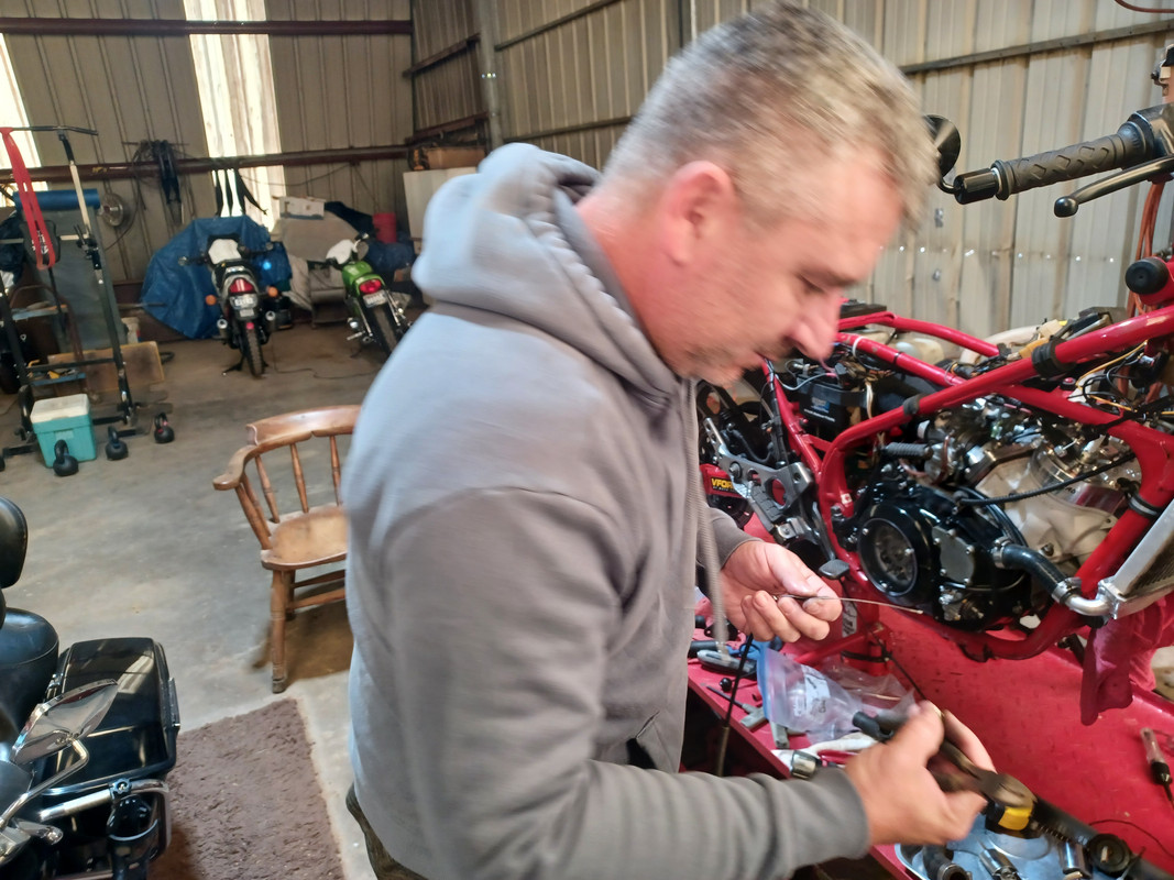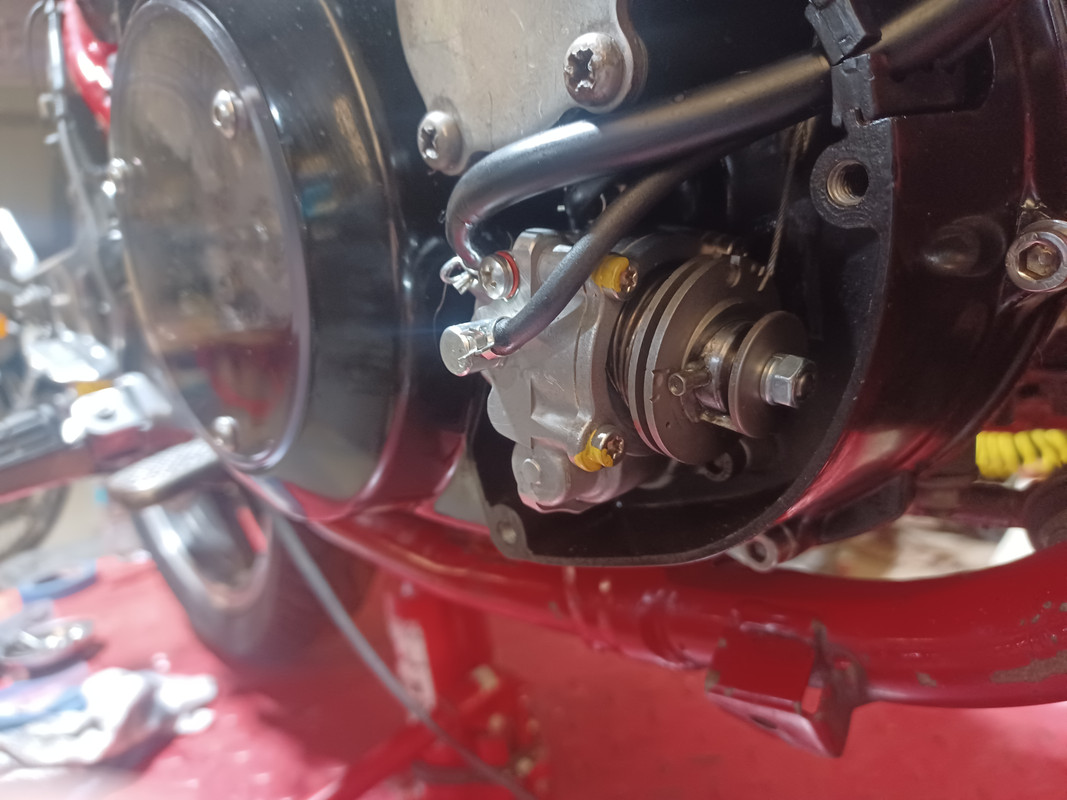 Arrow's pump #81 cable rigged and bled after filling the oil tank with Blue Marble. Frank B came over and once again we got after it. We had to put my factory Yamaha 29L oil pump cable in the custom cable splitter and add some waters under the barrel where it goes into the clutch cover to get the throw right and the cables rigged correctly.