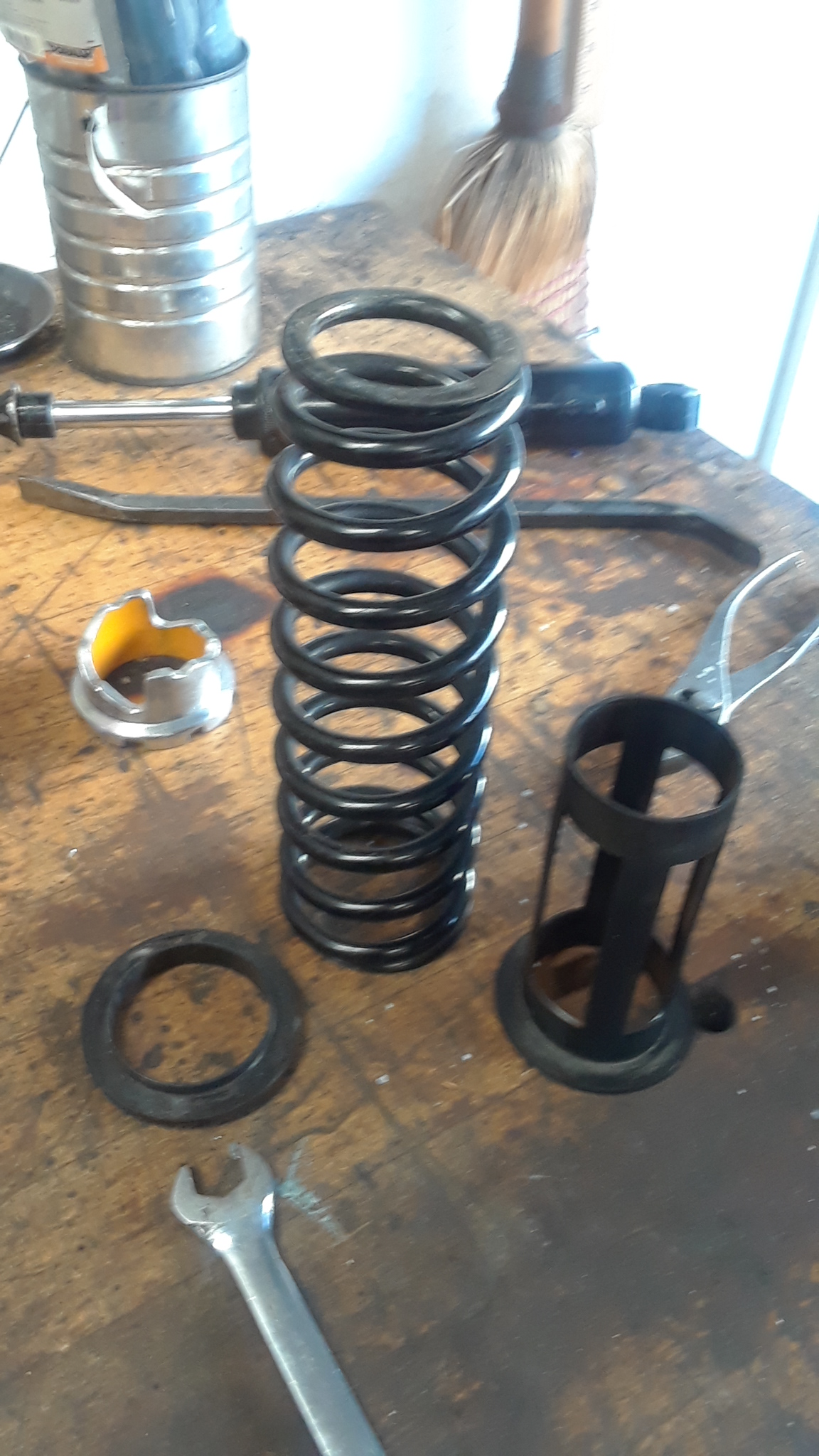 nothing too technically complex, put cleaned off the yellow paint from the lower spring and collar and adjuster. cleared the cleaned aluminum, painted lower spring white.