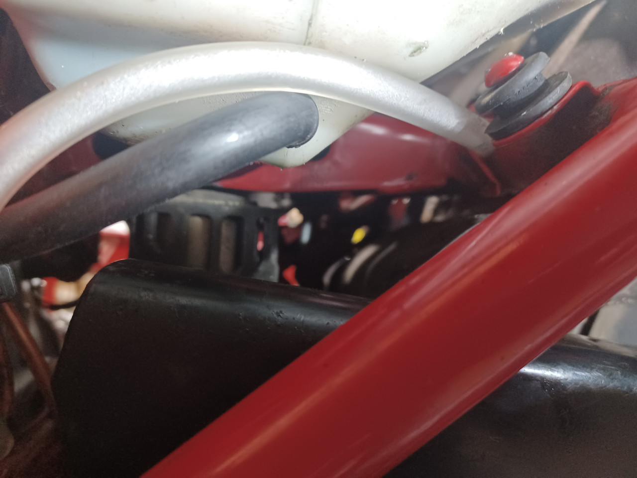 Today's small shop project materialized while doing some much needed clean-up on the Gray Ghost 421. I was wiping off up under the motor and saw a couple drops of 2 stroke oil hanging off of the rear shock. Turns out the circa 1984 factory oil tank vent/over flow hose is way short and hard as a rock right next to the shock. I replaced it with some clear hose from my stash.